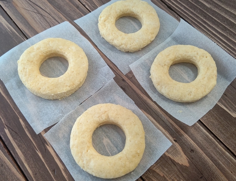 - ドーナツ型か、大小のリングで抜いていく。オーブンシートにのせ、そのまま揚げられるようにする。